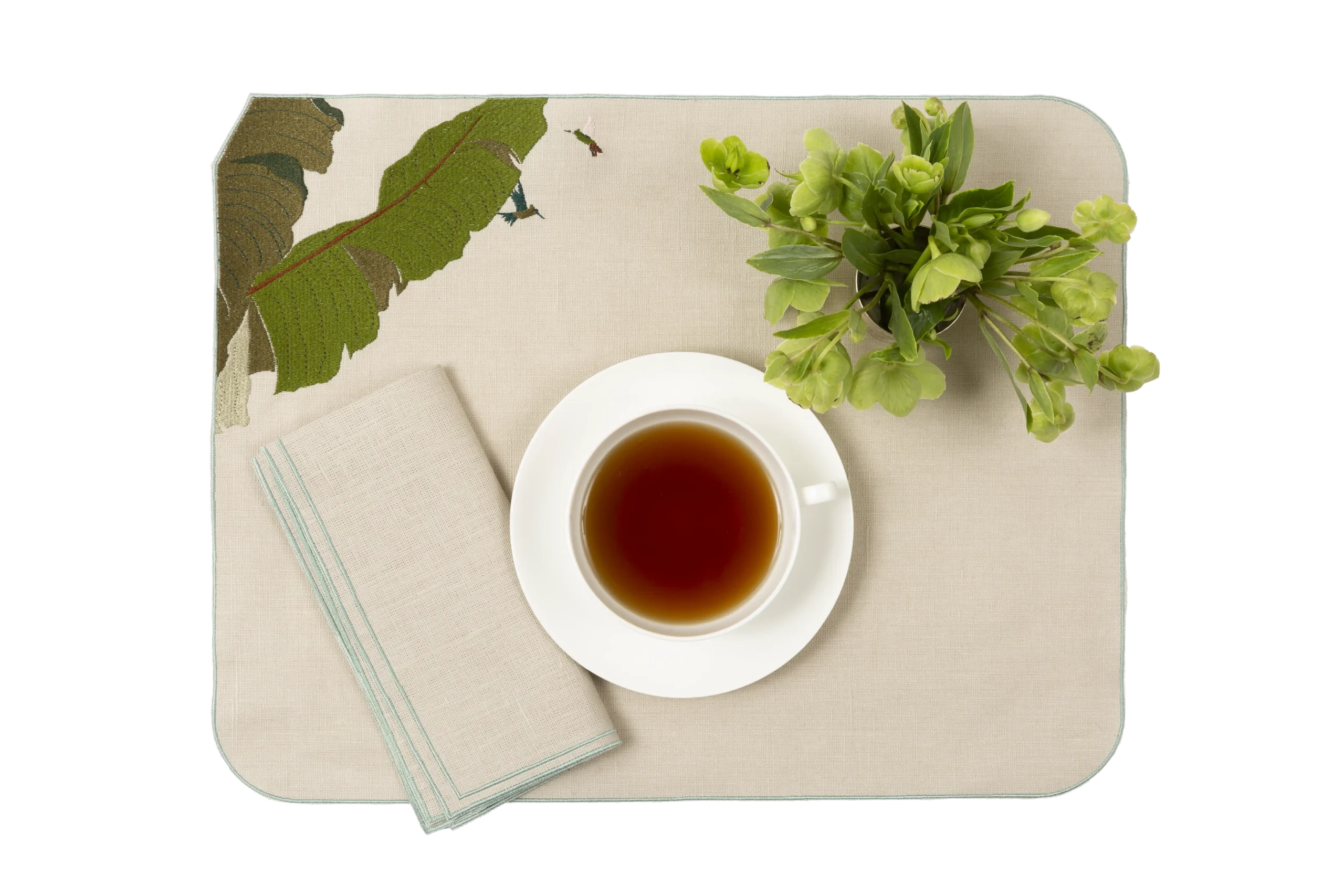La tovaglietta Banano, un’ode alla bellezza tropicale e alla freschezza naturale. Caratterizzata da angoli stondati che aggiungono un tocco di morbidezza, questa tovaglietta è impreziosita da un ricco ricamo di foglie di banano e uccellini, che evocano l’atmosfera rilassata e vibrante delle ambientazioni tropicali.