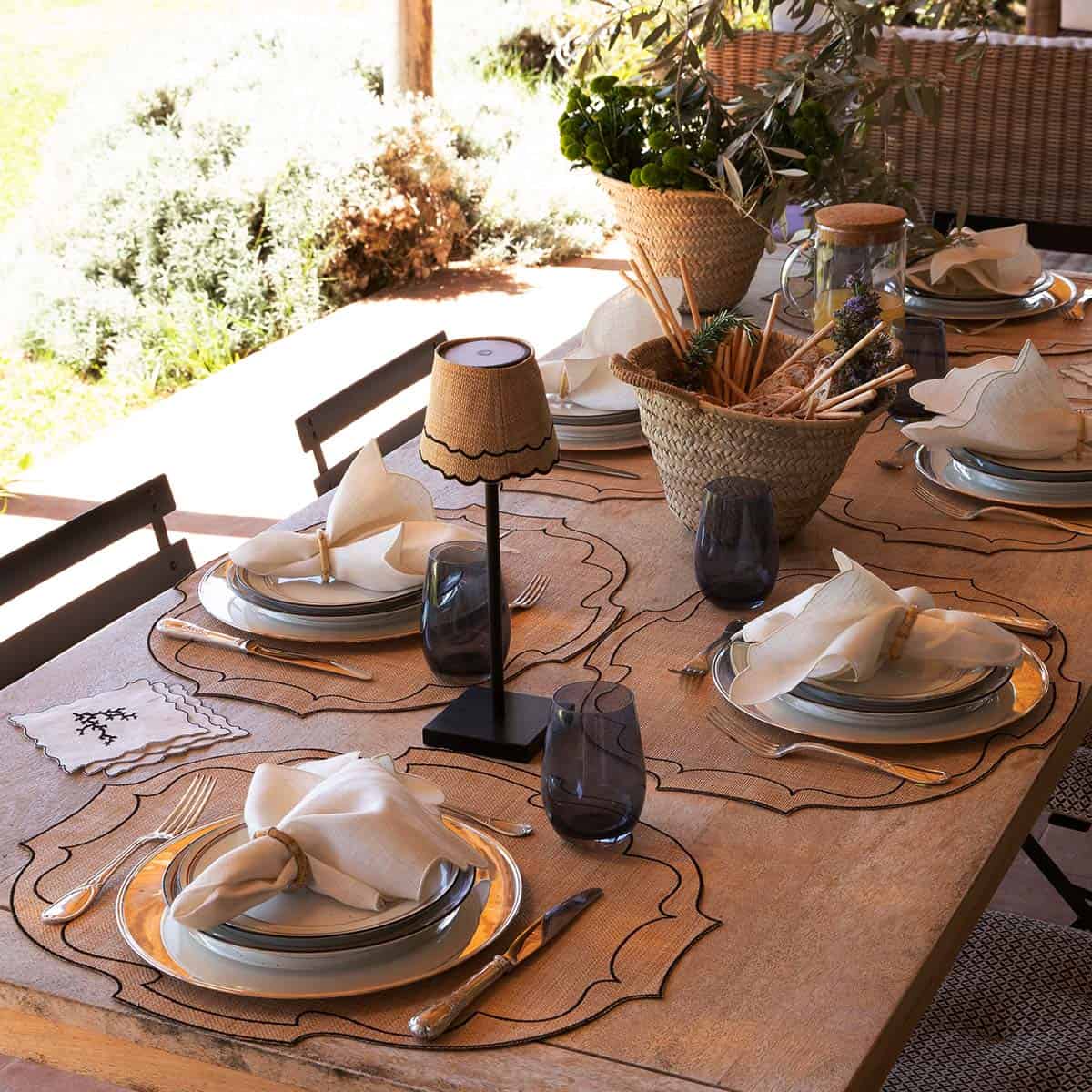 Copri paralume in rafia con bordo ricamato, ideale per lampade ricaricabili. Disponibile in vari colori. Eleganza naturale e luce d’atmosfera.