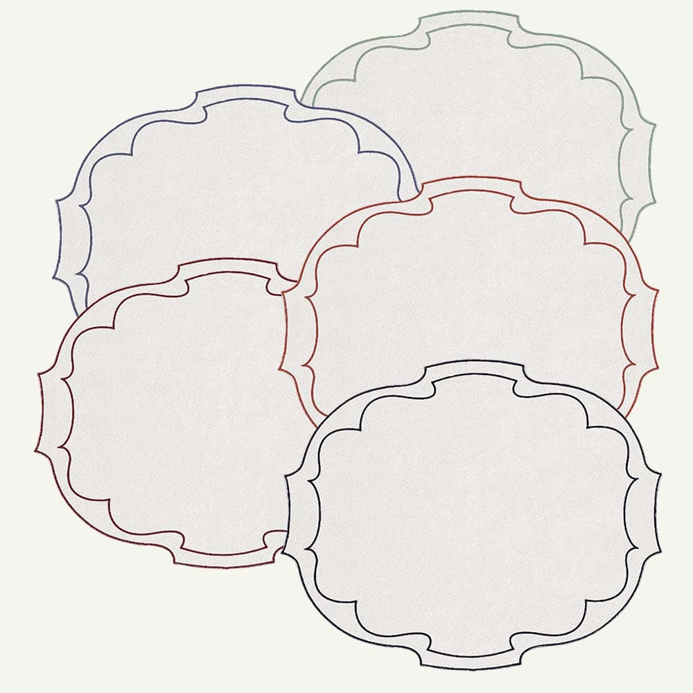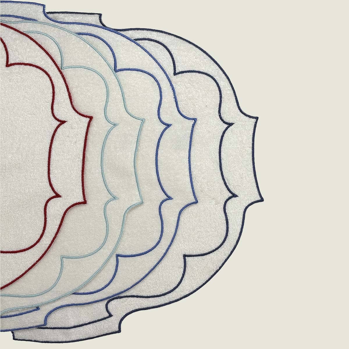 Realizzate artigianalmente con taglio a mano e profilo ricamato, sono disponibili in avorio con il bordo in una ricca gamma di colori: dal turchese al brique, dal beige al denim.