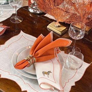 I nostri tovaglioli in lino sono progettati per accompagnare perfettamente le tovagliette americane, riprendendone le caratteristiche distintive, come le volute e gli angoli a punta.