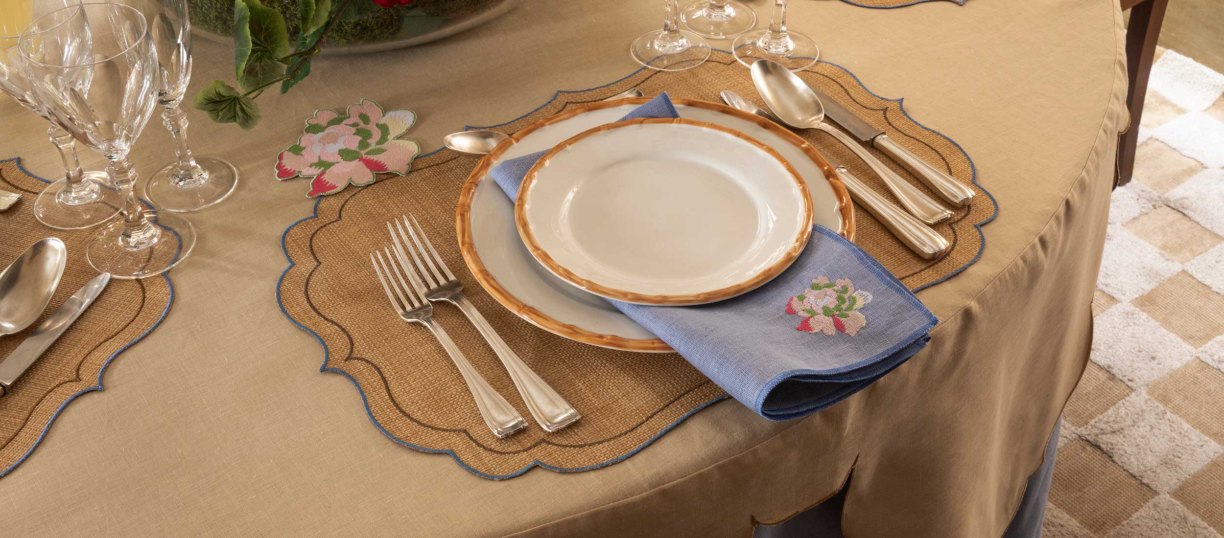 Made in Italy from pure and coated linen, each piece reflects refinement and practicality, with a finish made to stand up to daily use. Cut and finished by hand, the finely embroidered edges are crafted using the Steil technique — a dense, corded stitch that reinforces the border and creates clean lines that never fray. Each piece can be customized in thousands of combinations of colors, trims, and details to create the exact table you envision.